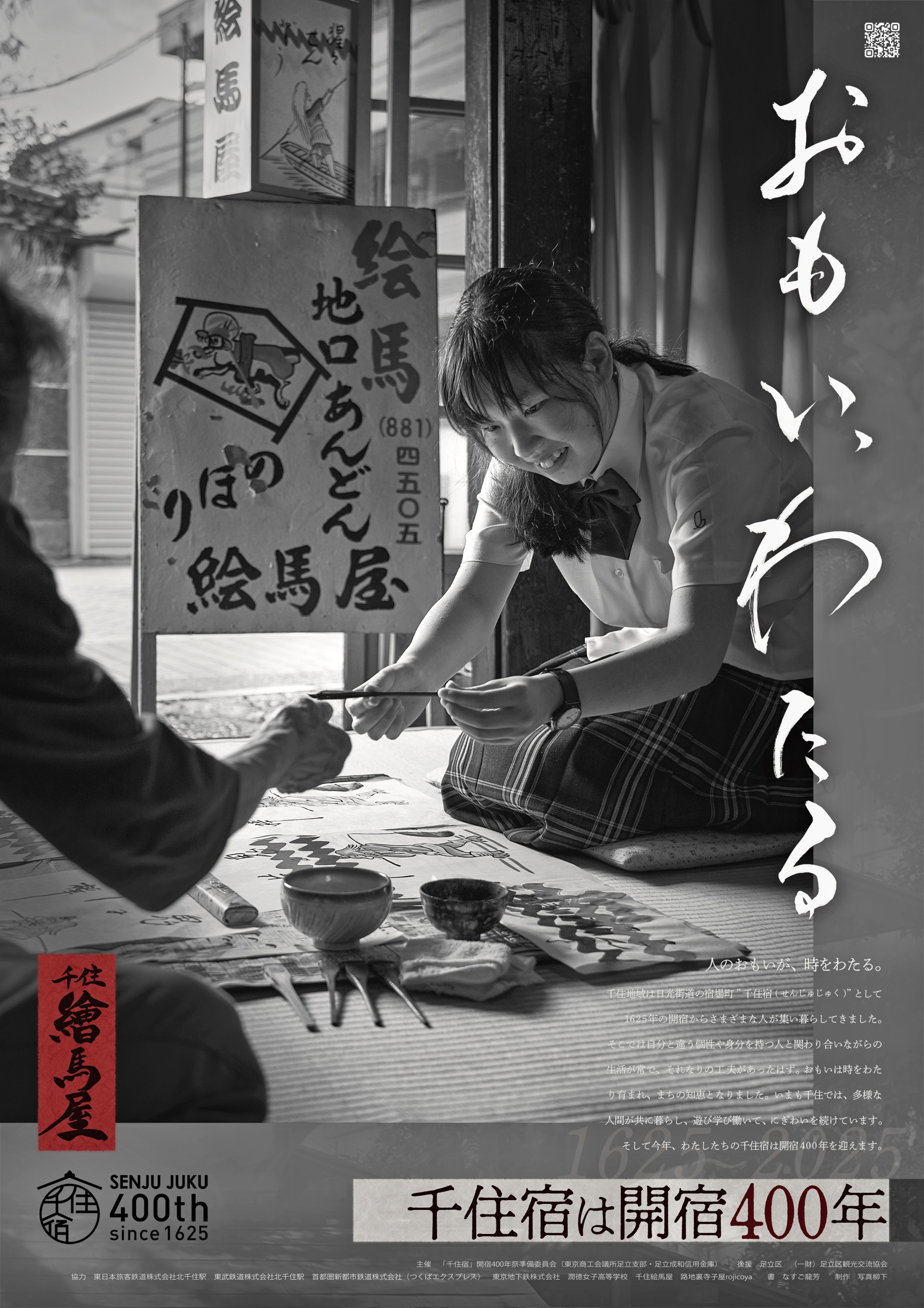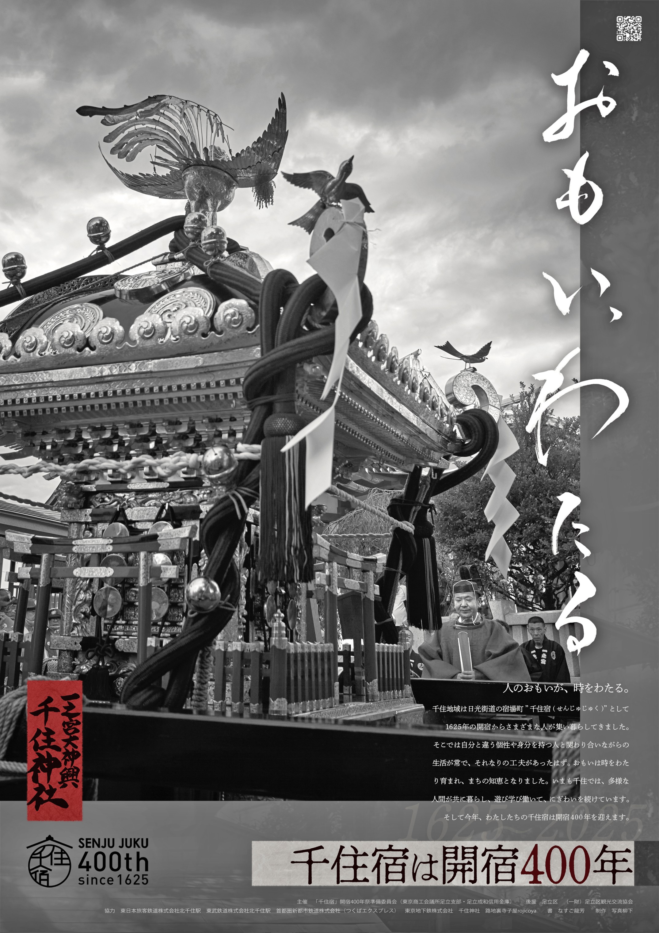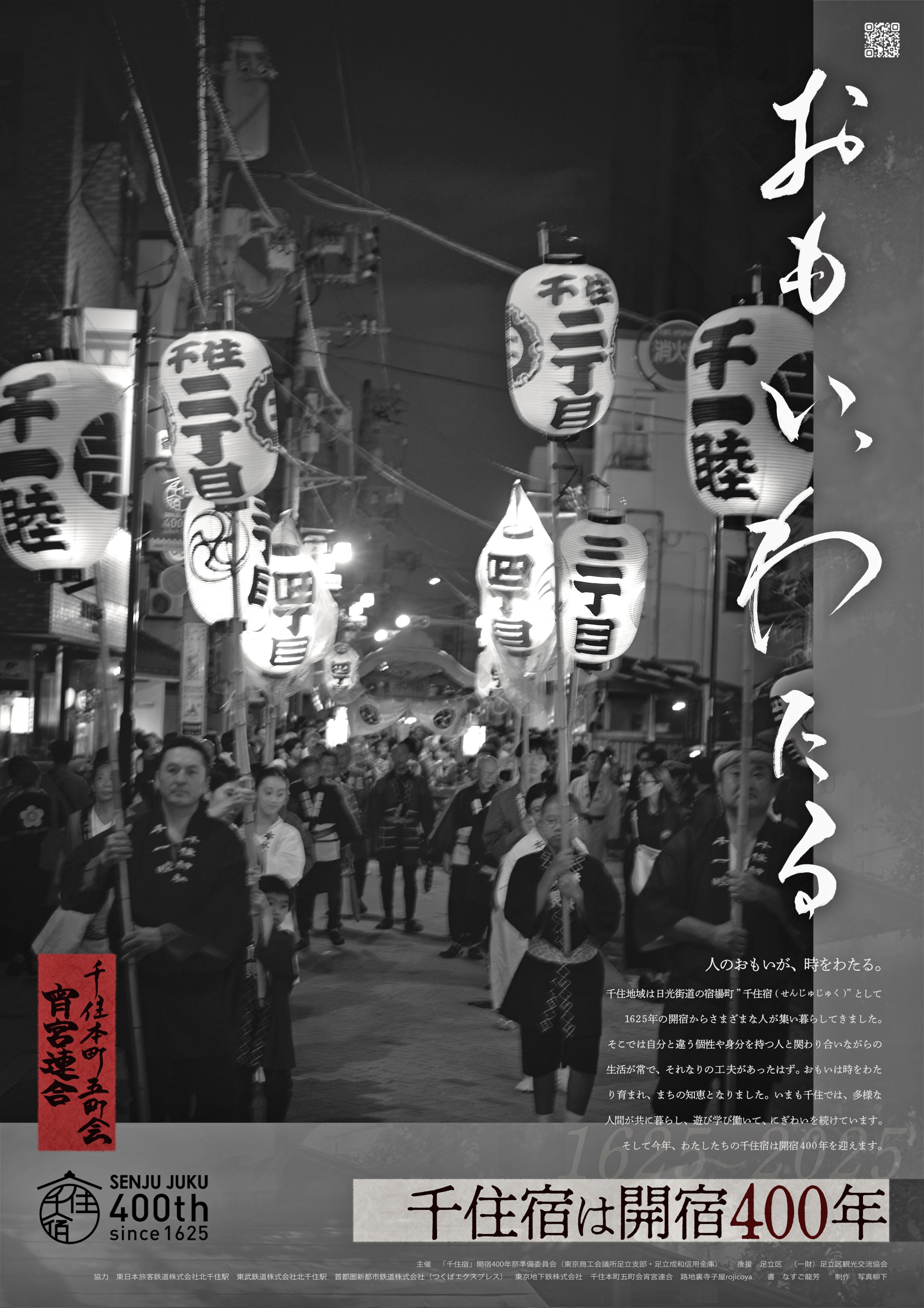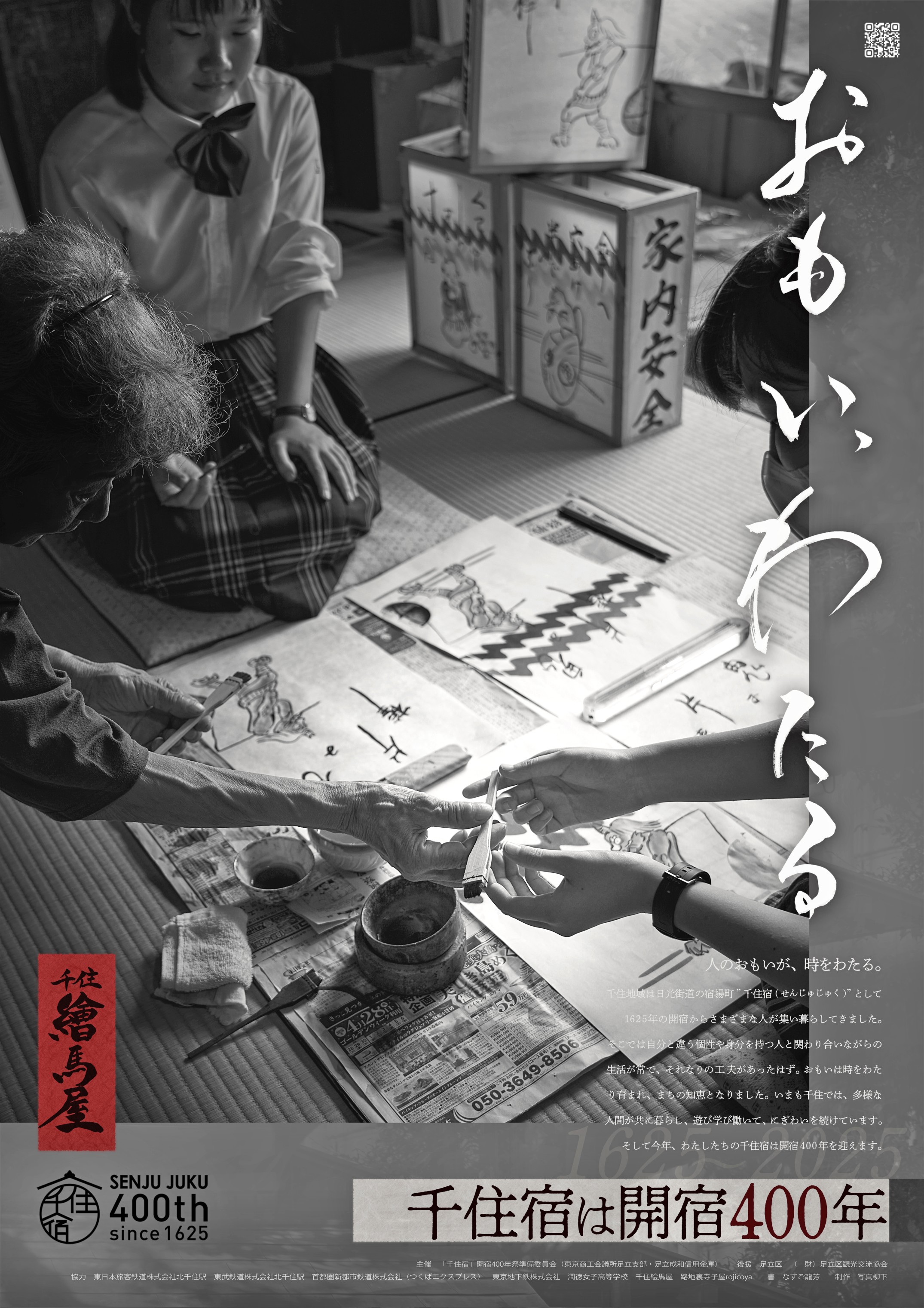 千住を含め足立区の方々にご協力をいただき、“「千住宿」開宿400年祭”の機運向上を目的としたイメージポスター "おもい、わたる" を制作いたしました。